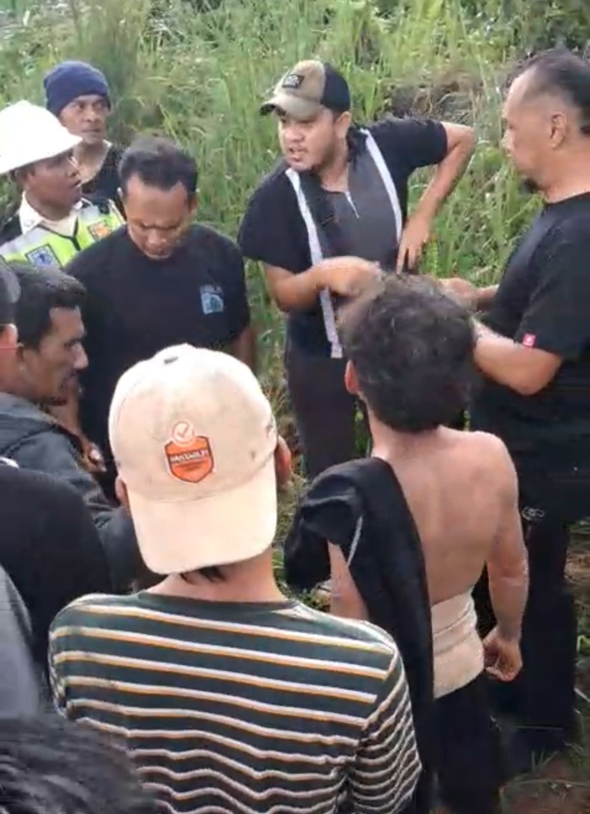 Tidak lama berselang, beberapa orang yang berada di sekitar kawasan gudang terlihat mendatangi kedua pria tersebut hingga akhirnya terjadi kerumunan. Situasi yang awalnya hanya berupa perdebatan kemudian berubah menjadi tegang ketika beberapa orang tampak mengerumuni dan menarik pakaian salah satu pria di tengah kerumunan tersebut.